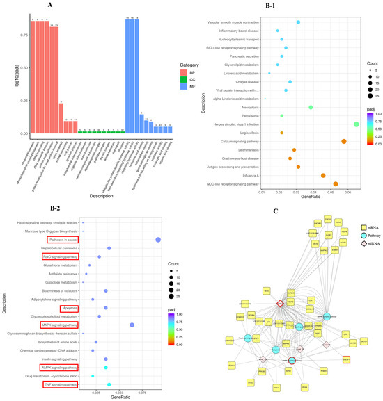 Figure 4. Analysis of the RNA-Seq. Note: (A): GO function enrichment of DE miRNAs (the numbers at the top of the bars) between the P and P_10 groups; the X-axis is the GO term, and the y-axis is the significance level of the GO term enrichment, represented by −log10(padj). Different colors indicate the different functional categories; count: the number of differential target genes annotated on the GO term. (B-1,B-2): The dot plot of the top 20 downregulated (B-1) and upregulated (B-2) pathways ranked based on the p-value. (C): The miRNAs-mRNAs-KEGG pathway interaction network; blue represents pathways, yellow represents mRNAs, and pink represents miRNAs. DE: differential expression; BP: biological processes; CC: cellular component; MF: molecular function. P group: GCs with 500 ng/mL PRL; P_10 group: GCs in the P group were infected by lentiviruses carrying overexpressed sequences of MAPK12.