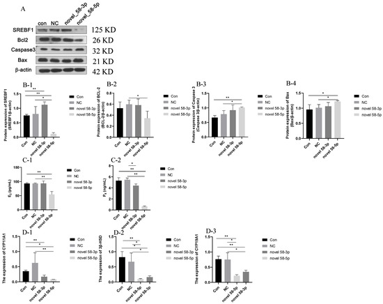 Figure 5. Steroid hormone secretion and related gene expression. Note: (A): Western blotting result; (B-1B-4): the expression of SREBF1 (B-1), BCL-2 (B-2), Caspase 3 (B-3), and Bax (B-4); (C-1,C-2): the secretion of E2 (C-1) and P4 (C-2); (D-1D-3): the expression of CYP11A1 (D-1), 3β-HSD (D-2), and CYP19A1 (D-3). “*” and “**” indicate 0.01 < p < 0.05 and p < 0.01, respectively. Con group: GCs with 500 ng/mL PRL; NC group: GCs in the Con group transfected with the negative control of mimics; novel 58-3p group: GCs in Con group transfected with novel 58-3p mimics; novel 58-5p group: GCs in Con group transfected with novel 58-5p mimics.