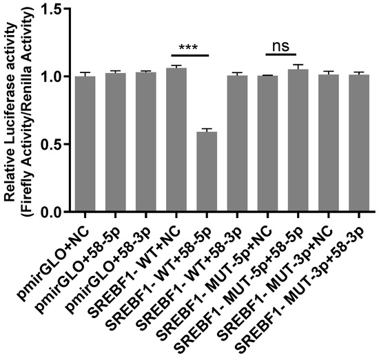 Figure 6. Analysis of the dual-luciferase reporter gene. Note: “***” indicates p < 0.001. pmirGLO+NC group: empty plasmid; pmirGLO+58-3p group: pmirGLO was established with novel 58-3p; pmirGLO+58-5p group: pmirGLO was established with novel 58-5p; SREBF1-WT+NC group: wild type SREBF1; SREBF1-WT+58-3P group: wild type SREBF1 was established with novel 58-3p; SREBF1-WT+58-5P group: wild type SREBF1 was established with novel 58-5p; SREBF1-MUT-5P+NC group: mutate SREBF1 at the 5p terminal binding site; SREBF1-MUT-5p+58-5p group: mutant SREBF1 was established with novel 58-5p; SREBF1-MUT-3p+NC group: mutate SREBF1 at the 3p terminal binding site; SREBF1-MUT-3p+58-3p group: mutant SREBF1 was established with novel 58-3p.