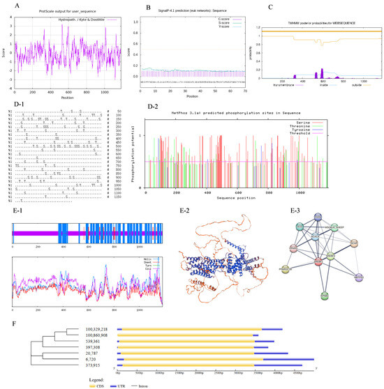 Figure 7. Bioanalysis of SREBF1. Note: (A): prediction of hydrophobicity of protein; (B): prediction of protein signal peptide. The dotted line represents the threshold for prediction; (C): prediction of protein transmembrane region; (D-1): prediction of phosphorylation site of ovine SREBF1. S represents for Serind, T represents for Threonine, Y represents for Tyrosine; (D-2): prediction of phosphorylation site score of ovine SREBF1; (E-1): the secondary structure of SREBF1; (E-2): tertiary structure of SREBF1; (E-3): protein interaction network; (F): analysis of ovine SREBF1 gene structure.