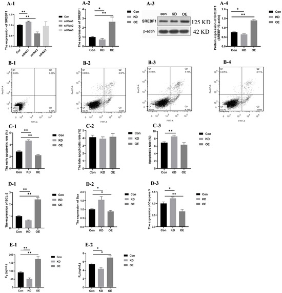 Figure 8. Functional validation of SREBF1. Note: “*” and “**” indicate 0.01 < p < 0.05 and p < 0.01, respectively. (A-1): The expression of SREBF1 after interference of siRNA1, siRNA2, and siRNA3; (A-2): the expression of SREBF1 in the con, KD, and OE groups; (A-3,A-4): the protein expression of SREBF1 in the con, KD, and OE groups; (B-1B-4): apoptosis of the negative control, con, KD, and OE group; (C-1C-3): the early apoptositic rate (C-1), late apoptositic rate (C-2), and total apoptositic rate (C-3); (D-1D-3): the expression of BCL-2 (D-1), Bax (D-2) and Caspase 3 (D-3); (E-1,E-2): the secretion of E2 (E-1) and P4 (E-2). (B-1B-4): The x-axis represents PI fluorescence; y-axis represents Annexin-V fluorescence. Q1 represents normal dead cells; Q2 represents late apoptotic or necrotic cells; Q3 represents early apoptotic cells; Q4 represents normal cells. Con group: GCs with 500 ng/mL PRL; KD group: GCs in Con group transfected with the interference sequence SREBF1; OE group: GCs in Con group transfected with the overexpressed sequence of SREBF1.