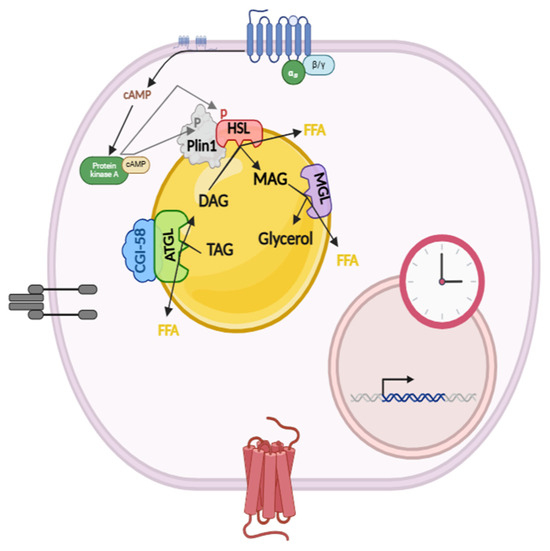 ATGL is the rate-limiting enzyme of this process and catalyzes the initial step of cleaving TAG into diacylglycerol (DAG) and FFAs [9]. Its activity is regulated by different proteins such as comparative gene identification-58 (CGI-58), also called α/β hydrolase domain-5 (ABHD5) [8,10,11]. On the other hand, hormone-sensitive lipase (HSL) hydrolyzes DAGs to monoacylglycerols (MAGS) and FFAs, but also acts on other substrates. HSL, once phosphorylated, increases its translocation from the cytosol to the LD and interacts with different LD-associated proteins, mainly perilipins, becoming activated [12,13]. MGL (monoglyceride lipase) finally cleaves MAGS into glycerol and FFA (Figure 1).