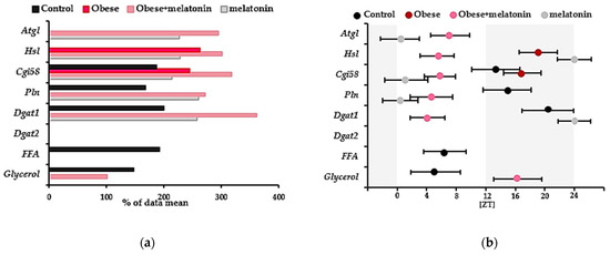 The effects of melatonin on the gene expression of this study are observed during the dark photoperiod (active/wakefulness phase) in both treated animal groups. In this photoperiod, melatonin treatment (2.3 mg/kg/day of melatonin in tap water) decreased relative gene expression of Hsl in mesenteric adipose tissue, as compared with the control group, and regardless of the diet provided. However, other authors describe that melatonin promotes lipolysis via upregulation of Hsl gene expression in mouse fibroblasts [62] and other genes such as Perilipin in bovine intramuscular adipose tissue [58]. Therefore, further studies are still needed to analyze the effect of melatonin on the relative gene expression of this enzyme. In addition to regulating Hsl gene expression, it could participate in controlling the gene transcription of other proteins such as CGI58, which is regulated by feeding and fasting cycles and by diet type, such as high-fat diets [63], but for other factors, its participation in controlling the gene transcription should be analyzed [62].