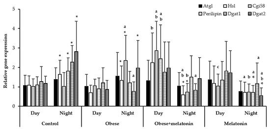 Relative Atgl, Hsl, Cgi58, Perilipin, Dgat1, and Dgat2 gene expression in mesenteric adipose tissue of rats fed a maintenance or high-fat diet with tap water or 2.3 mg/kg/day of melatonin in drinking water for 11 weeks. Analyses were performed during light and dark photoperiods. Each value represents the mean ± SD (n = 15). Statistical analyses of mean values of mRNA expression of genes were conducted using SPSS Statistics 27.0. If the data met the assumptions of normality, an appropriate statistical test was selected, which could include univariate analysis of variance, independent samples t-tests, or one-way ANOVA, followed by post-hoc Bonferroni’s multiple comparison tests to assess group differences. If the data did not meet the normality assumptions, the Kruskal–Wallis test or Mann–Whitney test was employed. * Indicate significant differences between photoperiods within each group (p < 0.05). Letters indicate significant differences between diets within the same photoperiod. a = p < 0.05 compared to the control group, b = p < 0.05 compared to the obese group, c = p < 0.05 compared to obese + melatonin group.