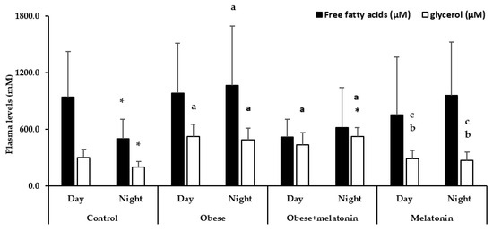 Plasma levels of FFA and glycerol in rats fed with a maintenance or high-fat diet and tap water or 2.3 mg/kg/day of melatonin in drinking water for 11 weeks, analyzed during light and dark photoperiods. Each value represents the mean and standard deviation (SD) (n = 15). Statistical analyses of mean values of mRNA expression of genes were conducted using SPSS Statistics 27.0. If the data met the assumptions of normality, an appropriate statistical test was selected, which could include univariate analysis of variance, independent samples t-tests, or one-way ANOVA, followed by post-hoc Bonferroni’s multiple comparison tests to assess group differences. If the data did not meet the normality assumptions, the Kruskal–Wallis test or Mann–Whitney test was employed. * Indicates significant differences between the different photoperiods analyzed within each experimental group. On the other hand, the letters indicate significant differences between the type of diet provided within the same photoperiod. a = p < 0.05 compared to the control group, b = p < 0.05 compared to the obese group, c = p < 0.05 compared to the control obese + melatonin group.