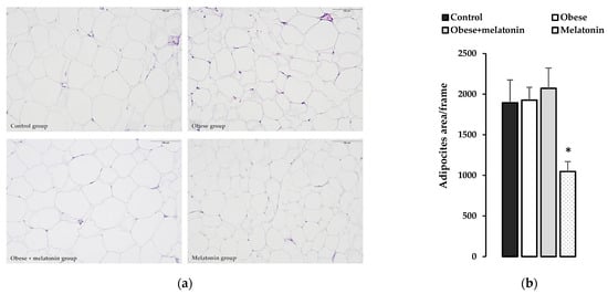 Morphological and morphometrics studies. (a) H/E staining of mesenchymal adipose tissue of each of the study group, showing the evident smaller size of mesenteric adipocytes in the melatonin group. (b) Data are represented as means ± SD adipocytes area/frame (n = 10/12) and significant differences between groups indicated by * p < 0.05.