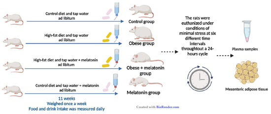 The study design is reflected in Figure 6. Animals were randomized to four experimental groups resulted from the combinations of a maintenance diet or high-fat diet and tap water or 2.3 mg/kg/day of melatonin (Sigma Aldrich, Madrid, Spain) in drinking water for 11 weeks (n = 30 per group). (1) Control group: maintenance diet (control diet) and tap water. (2) Obese group: high-fat diet and tap water. (3) Obese group + melatonin: high-fat diet and melatonin supplementation of 2.3 mg/kg/day in tap water. (4) Melatonin group: control diet and melatonin supplementation of 2.3 mg/kg/day in drinking water. Rats are nocturnal animals; therefore, food intake occurs during the dark photoperiod.