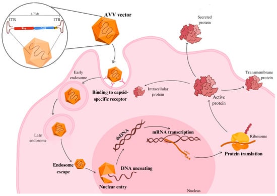 AAVs enter cells via receptor-mediated endocytosis and traffic through the endosomal pathway. Following endosomal escape, the viral particles reach the nucleus, where their single-stranded genome is converted into double-stranded DNA by host cell polymerases (Figure 1) []. Notably, rAAVs generally persist as episomes within the nucleus, avoiding integration into the host genome. This feature minimizes genotoxic risks and supports their established reputation as safe vectors for long-term transgene expression [,]. Nonetheless, integration events, though infrequent (0.1–1% of cases), have prompted ongoing research into their long-term safety profile [,].