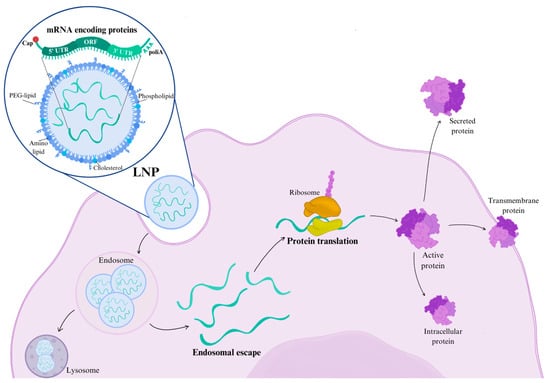 Mechanism of action of LNP-encapsulated mRNA in gene therapy. LNPs deliver therapeutic mRNA into target cells, where the mRNA is released from endosomes into the cytoplasm. Once in the cytoplasm, the mRNA is translated into the corresponding protein, which then reaches its intracellular or extracellular locations. LNP: lipid nanoparticles; mRNA: messenger ribonucleic acid; PEG-lipid: polyethylene glycol-lipid.
