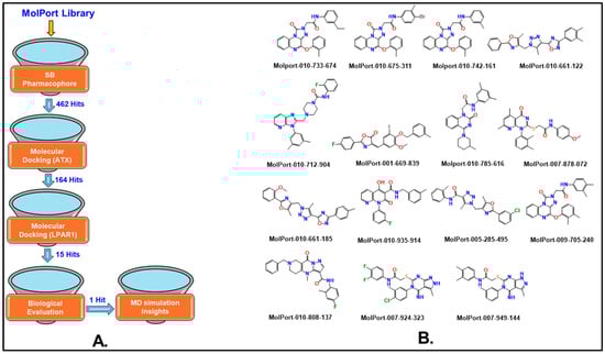 (A) Workflow of the virtual screening process used in this study. (B) The top 15 compounds were purchased and biologically evaluated for ATX enzyme inhibition. (SB stands for structure-based). Conventional colors of elements were used to represent nitrogen in blue, oxygen in red, sulfur in yellow, chlorine, and fluorine in green.