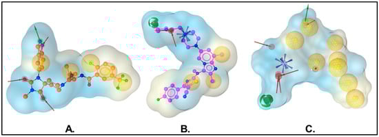 SB pharmacophore models generated using the software package LigandScout. (A) SB pharma-cophore model for the protein–ligand complex with PDB ID: 6W35. (B) SB pharmacophore model for the protein–ligand complex with PDB ID: 5MHP. (C) The final merged-feature pharmacophore model consisting of 17 features: eight hydrophobic features, two hydrogen bond donors, six hy-drogen bond acceptors, and one positive ionizable feature. Exclusion volumes are omitted.