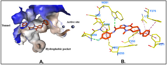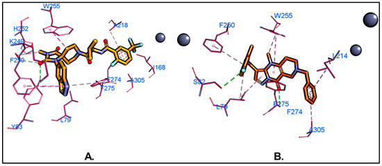 Molecular docking is an essential step in virtual screening, predicting the optimal orientation of a molecule within a binding site of the target protein and estimating the strength and nature of the interaction. This process involves positioning ligands into the protein’s binding pocket and evaluating their fit using scoring functions that consider various interaction forces, such as hydrogen bonds, hydrophobic interactions, and van der Waals forces. In this study, top candidates from SB pharmacophore screening (n = 462, pharmacophore fit-score ≥ 50) underwent further filtering through molecular docking-based screening. The compounds were first docked against ATX (PDB ID: 6W35) and then against LPAR1. The docking experiment was authenticated by redocking the native ligand into the protein structure of the PDB complex, and an RMSD of 0.589 Å (DockRMSD server) was obtained upon overlapping the crystal pose against the docking pose, which substantiates the reproducibility of our docking procedure (Figure S1, Supplementary Information). It was identified that the native ligand at the ATX active site was a hybrid tunnel–pocket inhibitor (Type IV). Docking with AutoDock Vina revealed several ligands with binding modes similar to the native ligand which interacted with key hydrophobic residues, including ALA218, LEU214, PHE274, PHE211, TRP261, TRP255, PHE275, and LEU79. Compounds with docking scores of −8.0 or lower, as determined by the AutoDock Vina scoring function, were classified as hits and subsequently docked against LPAR1. The top 15 compounds with the highest docking scores against both targets, ATX and LPAR1, were selected for purchase and further biological evaluation (Table S1, Supplementary Information). MolPort-137, identified as a biologically validated hit through the autotaxin inhibition experiment in vitro, formed a hydrogen bond with PHE275, a residue found between the tunnel and the hydrophobic pocket at the ATX active site. Additionally, MolPort-137 formed a halogen bond with SER82 through its fluorine atom, along with van der Waals interactions with TRP255, LEU214, and ALA305 (Figure 4). The docking pose indicated that MolPort-137 binds within the tunnel, extending slightly into the hydrophobic pocket.