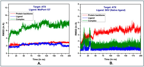 RMSD analysis of protein–ligand MD simulations for: (A) MolPort-137 ATX complex and (B) native ligand ATX complex (PDB ID: 6W35).
