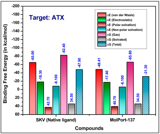 Binding free energies for the native ligand (PDB ID: 6W35) and MolPort-137 against ATX using the MM-GBSA method.