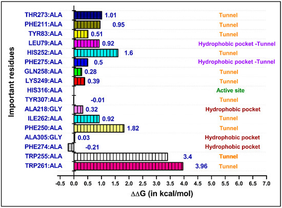 In this expression, a highly positive ΔΔG value signifies a significant role of the specific residue in ligand binding.