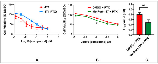 (A) Paclitaxel-resistant 4T1 cells were generated using dose-escalation with PTX and final 4T1-PTXr cell lines were tested for their sensitivity to PTX as compared to parental 4T1 cells. All cell lines were plated with multiple 3-fold serial dilutions of PTX for three days. Normalized values were used to determine the GI50 for each cell line. The 4T1 cells show a three-day GI50 value of 24 ± 0.9 nM, while 4T1-PTXr cells show an impaired response with a GI50 value of 114 ± 17 nM. (B) The 4T1-PTXr cells were plated with 3 μM MolPort-137 for 24 h, and then serial dilutions of PTX were added to each well for an additional 48 h. All values were normalized as in (A), and the graph shows the average cell viability obtained at each dose depicted. (C) Data in (B) were used to calculate the GI50 for each condition, as shown in the bar graph (n = 3 biological replicates for all assays; error bars are SE). GraphPad Prism was employed to perform two-tailed unpaired Student’s t-tests. In panel (B), the concentration indicated with an asterisk (*) was statistically significant (p < 0.05) with a p-value of 0.0466. In panel (C), the calculated p-value was 0.0656.