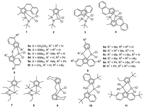 Xu and coworkers catalyzed the polymerization of 4 MP using a series of constrained-geometry complexes (CGCs) and a bridged metallocene catalyst []. The structure of the catalysts is shown in Figure 2. It was found that CGCs (1–3) and the bridged catalyst (4) exhibit high catalytic activity (~106 g·mol−1·h−1) and narrow molecular weight distributions (MWDs) (<3). The larger the steric hindrance of substituents in CGCs, the higher the molecular weight of PMP, but the isotacticity is poor (<40%), while the activity of 4 was higher (5 × 106 g·mol−1·h−1), and the isotacticity of PMP was also increased to 94%. Duchateau used a series of C2-, Cs-, and C1- symmetric zirconocenes to catalyze 4 MP polymerization []. The polymerization activities for C2-symmetric zirconocenes at varying temperatures are 5a > 5d >> 5b > 5c > 5e. Except for catalyst 5c, the molecular weights of the PMPs using these catalysts are relatively low (Mw ≤ 42.2 × 104 g·mol−1), and all PMPs exhibit relative narrow MWDs (≤3.3) and a high melting temperature (Tm ≥ 200 °C). Unlike the C2- symmetric zirconocenes, for C1- and Cs- symmetric zirconocenes catalysts 6a–6f, the substituents on the bridge, the cyclopentadienyl (Cp) and fluorenyl (Flu) ligands, have a significant impact on the polymerization of 4 MP. The Cp tert-butyl substituent enhanced the catalyst activity, polymer molecular weight, and regioregularity at low temperatures, while the regioregularity is lower at higher temperatures. Phenyl substituents on the bridge have a limited effect on the polymer molecular weights. The molecular weights of the polymers were considerably higher than those of the PMPs obtained with 5a–5e, and the activities of these catalysts are also very high compared to the corresponding C2- symmetric catalysts. The C1- symmetric catalyst 6f has the highest activity (up to 4.38 × 106 g·mol−1·h−1), obtaining PMPs with high isotacticity, high Mw (up to 1.7 × 105 g·mol−1), narrow MWDs (≤2.2), and high Tm (up to 238 °C).