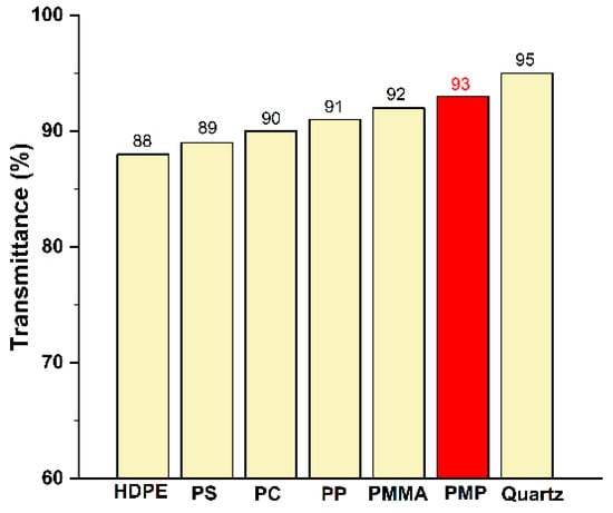 The unique helical molecular chain structure of PMP significantly reduces the optical anisotropy of its molecules, leading to a density of the crystalline and amorphous regions that is quite similar. This characteristic contributes to PMP’s impressive optical isotropy and transparency, with a haze value of less than 5%. Commercial PMP resins typically achieve optical transmittance in the range of 90–93%, with transmittance that surpasses that of most common polymers (Figure 5). PMP stands out as the only crystalline polymer among high-transparency resins. This excellent optical performance makes PMP highly suitable for various applications, such as lighting fixtures, food containers, animal feeding enclosures, laboratory equipment, and other sectors where clarity and transparency are essential. Moreover, compared to other transparent materials, PMP holds a distinct advantage. For instance, while materials like polycarbonate (PC) and PMMA are commonly used for their clarity, they can exhibit higher levels of optical distortion and lower UV resistance. PMP’s low haze and superior UV transmission make it especially attractive for applications requiring prolonged exposure to sunlight without significant yellowing or degradation, and its unique properties position it as a formidable contender in the transparent resin market.