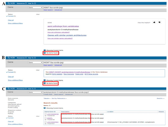The search results for different forms of the pig ASMT gene in the NCBI database. (A) The search results for the pig ASMT abbreviation in the NCBI database. (B) The search results for another name for pig ASMT in the NCBI database. (C) The search results for the full name of the pig ASMT gene in the NCBI database.