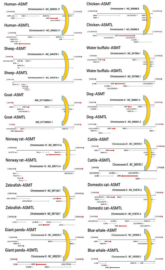 Using the NCBI Genome Data Viewer, we retrieved ASMT gene data from various species, including humans (Homo sapiens), sheep (Ovis aries), horses (Equus caballus), cattle (Bos taurus), buffalo (Bubalus bubalis), giant pandas (Ailuropoda melanoleuca), mice (Mus musculus), dogs (Canis lupus familiaris), domestic cats (Felis catus), blue whales (Balaenoptera musculus), chickens (Gallus gallus), and zebrafish (Danio rerio). We then analyzed and compared the chromosomal locations of the ASMT gene and its neighboring genes. As shown in Figure 3, the results revealed that in most mammals, including humans, sheep, horses, cattle, buffalo, giant pandas, mice, dogs, domestic cats, and blue whales, the ASMT gene is primarily located on the X chromosome. Furthermore, it was observed that the AKAP17A gene is often found adjacent to the ASMT gene, and the two genes are consistently oriented in the same direction, regardless of whether the species is mammalian, avian, or piscine.