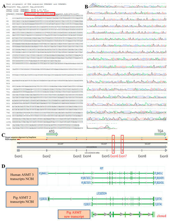 Sequencing results and alignment analysis of the pig ASMT gene cloning. (A) The alignment of the cloned pig ASMT gene sequence with the reference sequence. (B) The Sanger sequencing chromatogram of the cloned pig ASMT gene sequence. (C) Visualization of the exon information of the cloned pig ASMT gene using SnapGene software. (D) Comparison of human ASMT gene transcripts and the existing and newly cloned pig ASMT transcripts in NCBI.