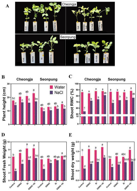 The combined application of GSNO and Si enhanced plant growth in the soybean cultivars Seonpung and Cheongja under salt stress. (A) The plant phenotype of Cheongja and Seonpung, (B) plant height, (C) shoot relative water content, (D) shoot fresh weight, and (E) shoot dry weight. Plants were treated with control, GSNO, Si, and GSNO + Si under two factors: water and salt conditions. Sampling was performed at 28 days of age. The bar graph displays the standard error of the mean, with each data point representing the average of three replicates. The letters on the bars indicate significant differences determined using the DMRT at p ≤ 0.05. The same letters indicate no significant differences.