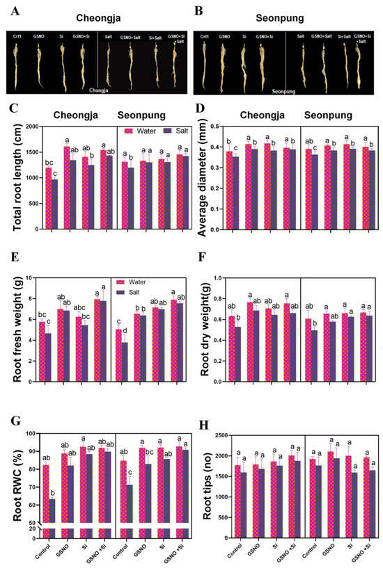 The combined GSNO and Si treatment improved root traits in the soybean cultivars Seonpung and Cheongja under salt stress. (A) The root morphology of Cheongja, (B) root morphology of Seonpung, (C) total root length, (D) average root diameter, (E) root fresh weight, (F) root dry weight, (G) root relative water content, and (H) number of root tips. The bar graph displays the standard error of the mean, with each data point representing the average of three replicates. The letters on the bars indicate significant differences determined using DMRT at p ≤ 0.05. The same letters indicate no significant differences.