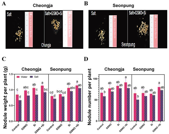 Combined GSNO and Si treatment increased nodule numbers in the soybean cultivars Seonpung and Cheongja under salt-induced stress. (A) Nodules in Cheongja, (B) nodules in Seonpung, (C) nodule weight, and (D) nodule number. A centimeter (cm) ruler in A and B is shown in for scale reference. The bar graph displays the standard error of the mean, with each data point representing the average of three replicates. The letters on the bars indicate significant differences determined using DMRT at p ≤ 0.05. The same letters indicate no significant differences.
