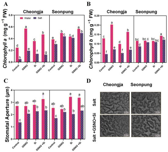 Combined GSNO and Si treatment promoted plant growth in Seonpung and Cheongja under salt stress. (A) Chlorophyll a, (B) chlorophyll b, (C) stomatal aperture, and (D) leaf stomata under a light microscope. The scale bar represents 5 µm. The bar graph displays the standard error of the mean, with each data point representing the average of three replicates. The letters on the bars indicate significant differences determined using DMRT at p ≤ 0.05. The same letters indicate no significant differences.