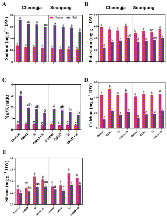 The combined GSNO and Si treatment regulates ion homeostasis in Seonpung and Cheongja under salt stress. (A) Na content, (B) K content, (C) Na/K ratio, (D) Ca content, and (E) Si accumulation. The bar graph displays the standard error of the mean, with each data point representing the average of three replicates. The letters on the bars indicate significant differences determined by DMRT at p ≤ 0.05. The same letters indicate no significant differences.
