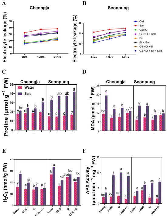 The combined GSNO and Si treatment reduced cell leakage, MDA, and H2O2 levels by increasing APX activity and proline accumulation in Seonpung and Cheongja under salt stress. (A) Electrolyte leakage in Cheongja, (B) electrolyte leakage in Seonpung, (C) proline content, (D) MDA content, (E) H2O2 content, and (F) APX activity. The bar graph displays the standard error of the mean, with each data point representing the average of three replicates. The letters on the bars indicate significant differences determined using DMRT at p ≤ 0.05. The same letters indicate no significant differences.