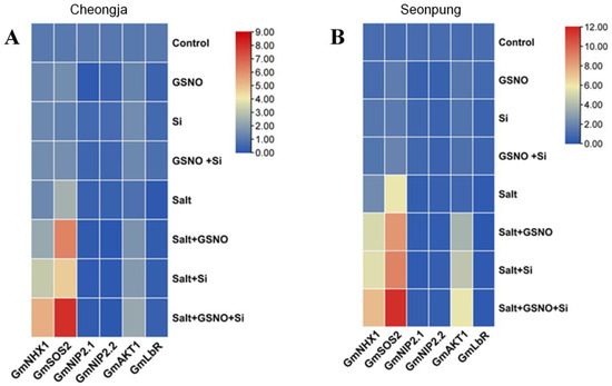 Heatmap of relative gene expression in response to treatments: (A) Cheongja and (B) Seonpung. The heatmap was generated using TBtools based on the mean expression values from three biological replicates. Red indicates high expression levels, while blue represents low expression levels, reflecting the correlation strength between gene expression and treatments. The genes analyzed include GmNHX1, GmSOS2, GmNIP2.1, GmNIP2.2, GmAKT1, and GmLbR, with treatments such as GSNO, Si, salt, and their combinations.