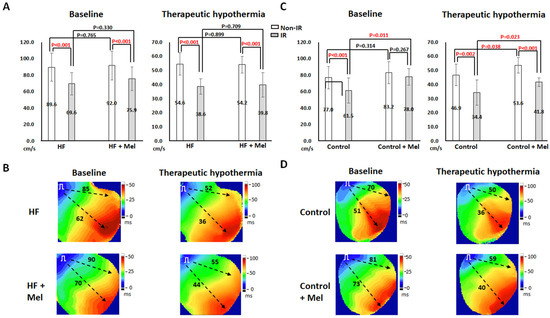 Effects of melatonin (Mel) and therapeutic hypothermia (TH) on conduction velocity (CV). (A,C) Summarized results of CV in the ischemia–reperfusion (IR) and non-IR zones in heart failure (HF) and control groups, respectively. (B,D) Representative examples of isochronal maps in HF and control groups, respectively. Numbers indicate the mean values of CV (in cm/s). Dashed black arrows indicate the directions of wavefront propagation.