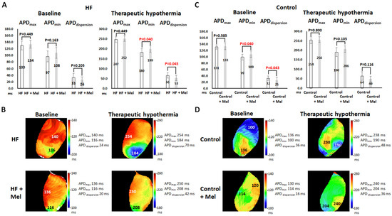 Effects of melatonin (Mel) on action potential duration (APD) at baseline and therapeutic hypothermia (TH). (A,C) Summarized results of maximal APD (APDmax), minimal APD (APDmin), and APD dispersion (APDdispersion) at baseline and TH with or without melatonin treatment in heart failure (HF) and control groups, respectively. (B,D) Representative APD maps in HF and control groups, respectively. Melatonin prolonged APDmin and thereby reduced APDdispersion in failing hearts at TH and in control hearts at normothermia. Numbers indicate the values of APD at sites of APDmax and APDmin in each map (in ms).
