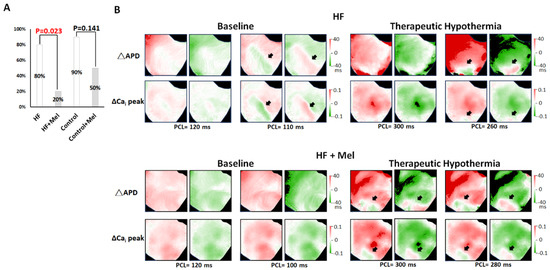 Effects of melatonin (Mel) and therapeutic hypothermia (TH) on spatially discordant alternans (SDA) induction. (A) Summarized results of SDA inducibility. (B) Representative examples of action potential duration (APD) and intracellular Ca2+ (Cai) alternans maps in heart failure (HF) (upper) and HF+Mel (bottom) groups. Black arrows indicate nodal lines. ΔAPD and ΔCai are the differences between the two consecutive APD and Cai amplitudes, respectively.