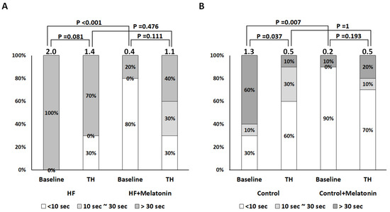 Effects of melatonin and therapeutic hypothermia (TH) on ventricular fibrillation (VF) severity. (A,B) Summarized results of VF severity in heart failure (HF) and control groups, respectively. Dark grey, light grey, and white color represent VF severity scores 2, 1, and 0, respectively, and the number at the top of each bar represents the mean of VF severity score. Melatonin significantly reduced VF severity in HF and control groups at baseline, which was counteracted by TH.