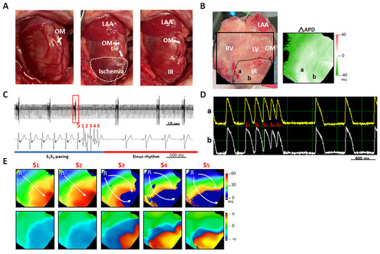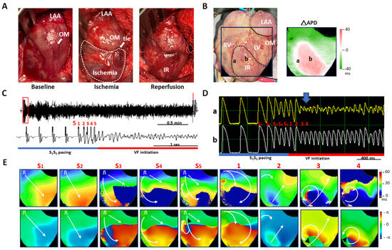 Ventricular fibrillation (VF) induction in a failing heart with acute ischemia-reperfusion (IR)-injury. (A) Photos of IR induction through obtuse marginal (OM) branch ligation and release. (B) Mapping field (left) and action potential duration alternans map (ΔAPD, right). (C) Pseudo-electrocardiograms show VF induction by extra stimulus pacing. The red arrow indicates a shock spike. The bottom pseudo-electrocardiogram corresponded to the period labeled by a red square in the upper pseudo-electrocardiogram. (D) Membrane voltage tracings during VF induction at sites “a” and “b” labeled in Panel (B). (E) Isochronal maps (upper) and phase maps (bottom) of VF induction (labeled in Panel (D)). White arrows indicate multiple impulses within the mapping field; black triangles indicate phase singularities. LAA, left atrial appendage; LV, left ventricle; RV, right ventricle.