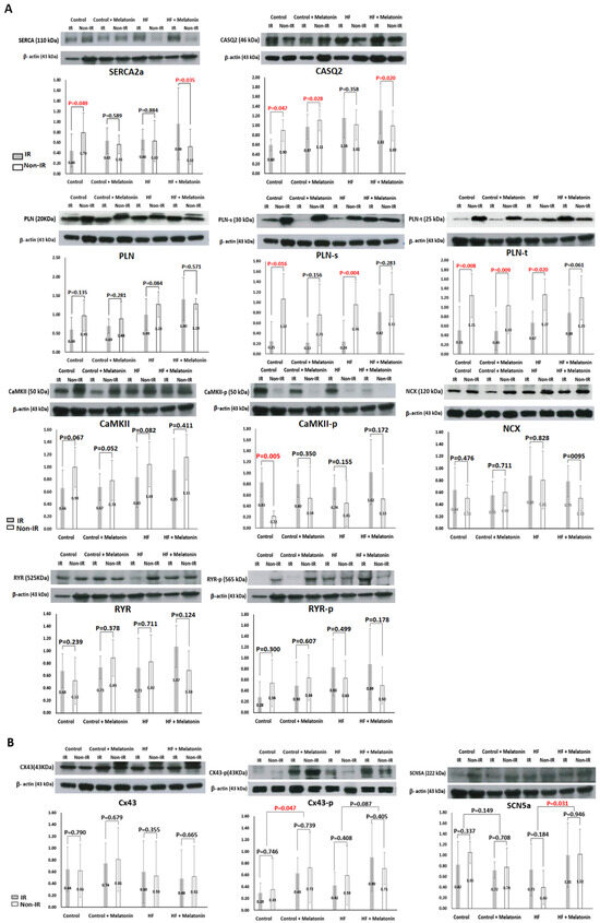 To elucidate the molecular targets of melatonin’s antiarrhythmic effects in IR-injured hearts, the levels of Ca2+-handling proteins, Na+ channel, and Cx43-associated proteins were measured and compared between the IR and non-IR zones. Figure 8A summarizes the results of Ca2+-handling protein expression. Melatonin upregulated SERCA2a expression (p = 0.035) and attenuated PLN-s (p = 0.283) and PLN-t (p = 0.061) downregulation in failing hearts and attenuated SERCA2a (p = 0.589) and PLN-s (p = 0.156) downregulation in control hearts. CASQ2 was downregulated in the IR zone of control hearts (p = 0.047). Melatonin failed to attenuate CASQ2 downregulation in control hearts (p = 0.028) but upregulated CASQ2 in failing hearts (p = 0.020). CaMKII-p was upregulated in the IR zone of control hearts (p = 0.005) and was attenuated by melatonin (p = 0.350). There were no significant differences in RyR, RyR-p, and NCX between the IR and non-IR zones in control and failing hearts. Figure 8B summarizes the results of Na+ channel and Cx43 protein expression analyses. There were no significant differences in Cx43, Cx43-p, or SCN5a protein expression between the IR and non-IR zones in any of the four groups. However, the Cx43-p protein level in the control+melatonin group was significantly higher than that in the control group (p = 0.047), and the SCN5a protein level was significantly higher in the HF+melatonin group than that in the HF group (p = 0.031).