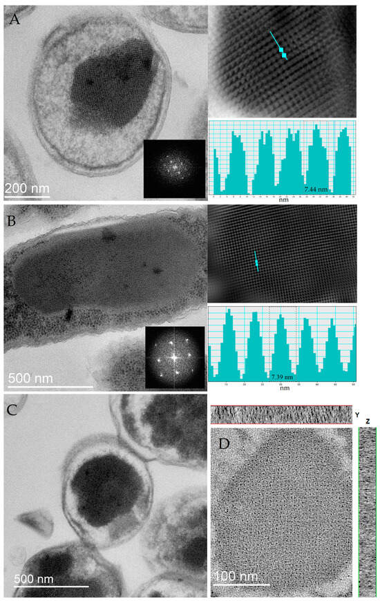 Electron micrographs of 2-day-old stationary E. coli Top cells: (A) TEM image of a typical cell with a small crystal, obtained in the absence of Dps protein overexpression. The inset on the lower right is the Fourier transform of the region containing the crystal. Top right—Fourier filtered image of the cell crystal, bottom right—intensity plot along the turquoise line, the dashed line indicates a repeat element of ~7.44 nm. (B) TEM image of a typical cell with a large crystal (cross-section) obtained under Dps protein overexpression conditions. The inset on the lower right is the Fourier transform of the region containing the crystal. Top right—Fourier filtered image of the cell crystal, bottom right—intensity plot along the turquoise line, the dashed line indicates a repeat element of ~7.39 nm. (C) TEM image of a typical cell with a large crystal (longitudinal section) obtained under conditions of Dps protein overexpression. The inset in the lower right corner is the Fourier transform of the region containing the crystal. (D) Tomogram of a cell containing a two-dimensional intracellular crystal. The slice thickness is 100 nm. The rectangles at the top and right show the intensity along the corresponding axes along the thickness of the slice.