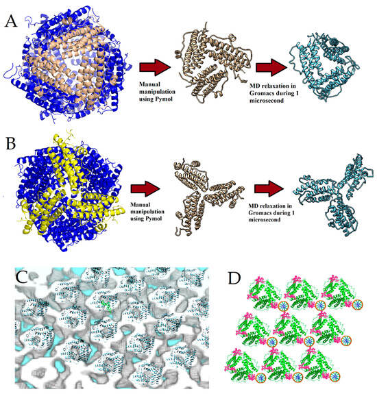 Modeling of the trimer structure from the dodecameric structure of the Dps protein using molecular dynamics methods. The protein is shown in blue. The three pore-forming subunits are highlighted in a different color. Trimers of two types were simulated for 1 μs in Na+Cl− solution. The initial positions of the monomers were obtained by cutting out (A) the ferritin pore (ΔΔGFerr = −185 kJ/mol) and (B) the Dps-type pore (ΔΔGDps = −115 kJ/mol). The red arrows show the structure at the initial time (tan) and after the simulation (blue). (C) Arrangement of the trimers simulated by molecular dynamics methods into the electron density tomography. Shown are electron density (grey-white) and a superimposed protein models (blue helices). (D) Arrangement of DNA molecules into the crystal structure of DNA–Dps. Protein trimers are shown in green. The ten N-terminal amino acid residues of Dps (including the main DNA-binding amino acid residues Lys5, Lys8, and Lys10) are marked in pink. The orange ones that look like wheels are DNA in cross-section.