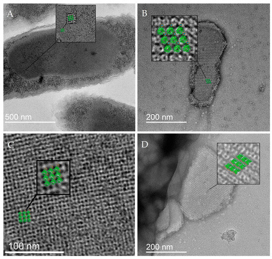 Superposition of the crystal model obtained from in vitro tomography data of DNA–Dps crystals with TEM images of intracellular crystals of 2-day-old E. coli Top cells: (A–C)—frontal orientation; (D)—lateral orientation.