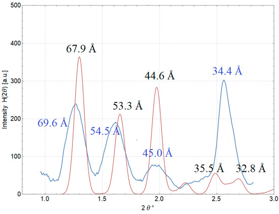 Based on the obtained structure of the intracellular DNA–Dps crystal, the scattering intensity of X-rays from such crystals in various spatial orientations was simulated. The intensity peaks from the crystal structure were modeled using the FFT program (https://www.ccp4.ac.uk) (Accessed on 10 December 2024) included in the CCP4 v9.0.005 software package. Then, the simulated peaks were blurred using a normal distribution with a standard deviation value corresponding to the peak width from crystals with a linear size of 200 nm. After that, the intensity of all peaks depending on the scattering angle was summed up and presented in Figure 6, together with the experimental intensity from intracellular crystals of 2-day-old E. coli Top cells obtained using the SAXS method. As can be seen from the figure, the position of the peaks of the model and the experimental curve are in very good agreement. This indicates the correctness of the constructed DNA–Dps crystal model since the experimental SAXS data give us information about the crystal structure of a very large number of intracellular crystals.