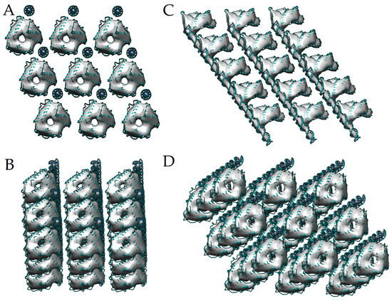 The structure of the DNA–Dps crystal obtained by molecular modeling methods. (A) front view; (B,C) side view; (D) view of the crystal in the tomography plane.
