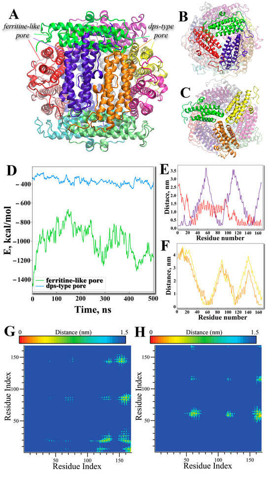 The structure of the Dps dodecamer (side view) in which each subunit is shown in its own color (A). Of the four ferritin-like pores and four Dps-type pores, examples are shown in one of the pores. The lines correspond to the colors of the subunits that form the pore. Ferritine-like pore view. (B), Dps-type pore view. (C). Different subunits are shown in different colours. The pore-forming subunits are highlighted brightly. Potential energy of interaction of subunits (D) within a ferritin-like pore (green) and a Dps-type pore (ice blue). Minimum distances between a green-colored residue and the other two residues in a ferritin-like pore (E) and a Dps-like pore (F). The colors of the curves in (E,F) correspond to the colors of the subunits with which the green-colored subunit interacts in (B,C). Mean smallest distances (contact map) between two subunits interacting within a ferritin-like pore (G) and a Dps-type pore (H). The color transition in the figures corresponds to distances from 0 nm (red color, close distance) to 1.5 nm (blue color, no interaction), see scales above the figures.