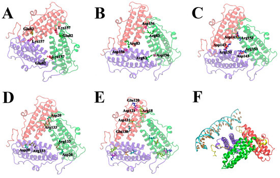 The main interacting amino acid residues that determine the binding of ferritin-like trimers: Glu82-Lys157 (A), Arg83-Asp156 (B), Asp143-Arg153 (C), Asp20-Arg133, Arg18 (of flexible N-terminus)—Glu120, Asp123, Asp131, Glu138 (E). The key amino acid residues involved in subunit binding within the trimer are indicated by three-letter code and number (A–E). Side view of a ferritin-like Dps trimer binding DNA (F). DNA is shown in ice blue. The flexible N-termini (amino acid residues 1–20) are shown in yellow in (F). The three interacting subunits of the Dps protein are shown in red, green, and purple in (A–F).
