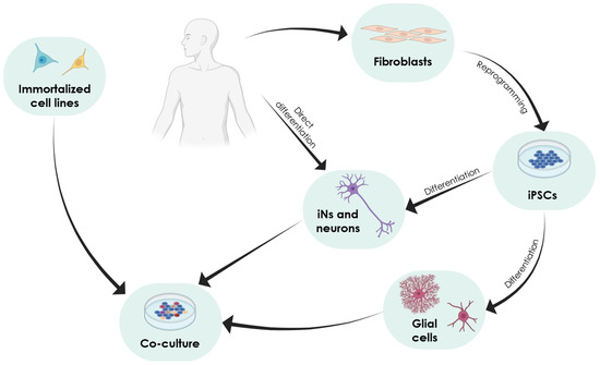 Scheme of the workflow for using 2D cell culture to study NDs. To establish co-cultures, fibroblasts from patients with NDs are isolated and reprogrammed into iPSCs. These cells can be differentiated in neurons and/or glial cells and used in co-cultures. Another strategy is to directly differentiate the somatic cells of ND patients into neurons (iNs) or to use immortalised cell lines in co-cultures.