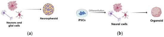 Schematic of biological-based strategies used to generate 3D cultures. (a) Neuronal cells can be cultured together to generate neurospheroids. (b) Method involving neurons and glial cells derived from patient’s iPSCs and extracellular matrix (Matrigel) to develop midbrain or brain organoids.
