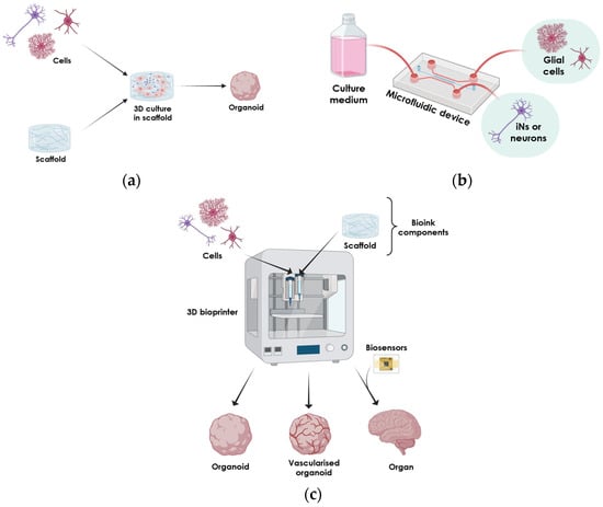 Below, we present 3D neural cell culture systems developed following a cellular-biology-based approach to generate organoids (Figure 3b), or from an engineering-based approach applying scaffold-based, microfluidic-based, and bioprinting systems (Figure 4, reviewed in [88]).