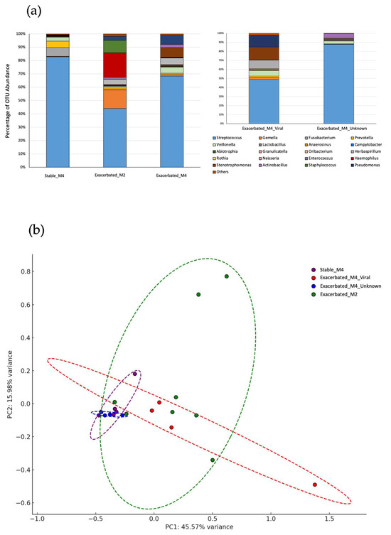 Classification of sputum samples into groups according to microbiota composition. (a) Relative abundance of Operational Taxonomic Units (OTUs) across clinical groups. The stacked bar plot shows the mean relative abundance at the bacterial genus level in participants. (b) Principal Component Analysis (PCA) of UniFrac Weighted Distance Matrix of samples by sample groups. Each sample represents an individual sample, color-coded by group: Stable_M4 (purple), Exacerbated_M2 (green), Exacerbated_M4_Viral (red), and Exacerbated_M4_Unknown (blue). Ellipses represent 95% confidence intervals for each group, indicating the variation within each sample category.