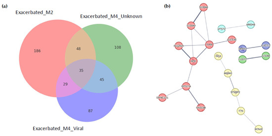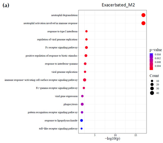 To identify key biological processes related to the pathophysiology of each type of exacerbation, a pathway enrichment analysis was performed. In all exacerbated groups, neutrophils were significantly activated [neutrophil activation involved in immune response and neutrophil degranulation (p-value ≤ 0.05)]. In samples classified as exacerbated by bacterial origin (Exacerbated_M2), 142 biological pathways were identified as statistically significantly involved in the exacerbation. Among them, pathways related to receptor-mediated phagocytosis [phagocytosis, Fc signaling receptor pathway, Fc-gamma receptor signaling pathway, response to lipopolysaccharide, pattern recognition receptor signaling pathway, toll-like receptor signaling pathway, and immune response-activating cell surface receptor signaling pathway] and the antiviral response [response to type I interferon, viral genome replication, the regulation of viral genome replication, and response to interferon-gamma and viral gene expression] (Figure 3a).